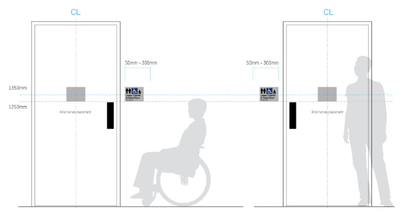1. On the wall on the latch side of the door with the leading edge of the sign located between 50mm and 300mm from the architrave